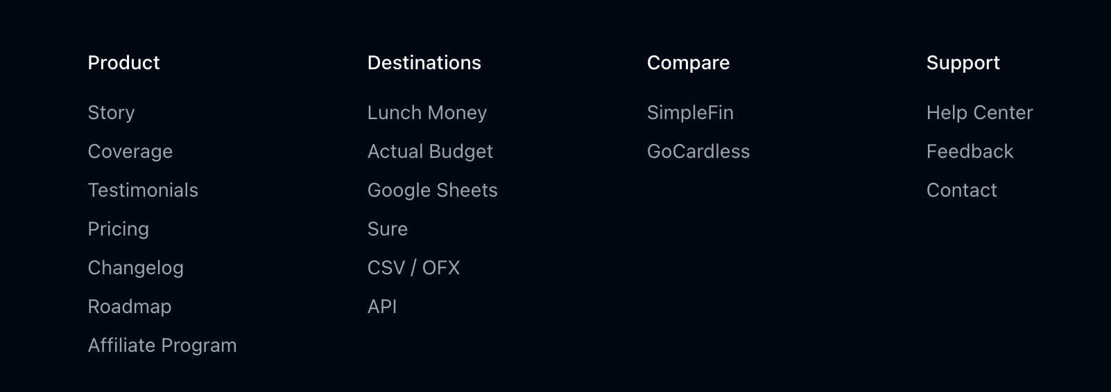 individual pages for different destinations we connect with, like Actual Budget and our API.