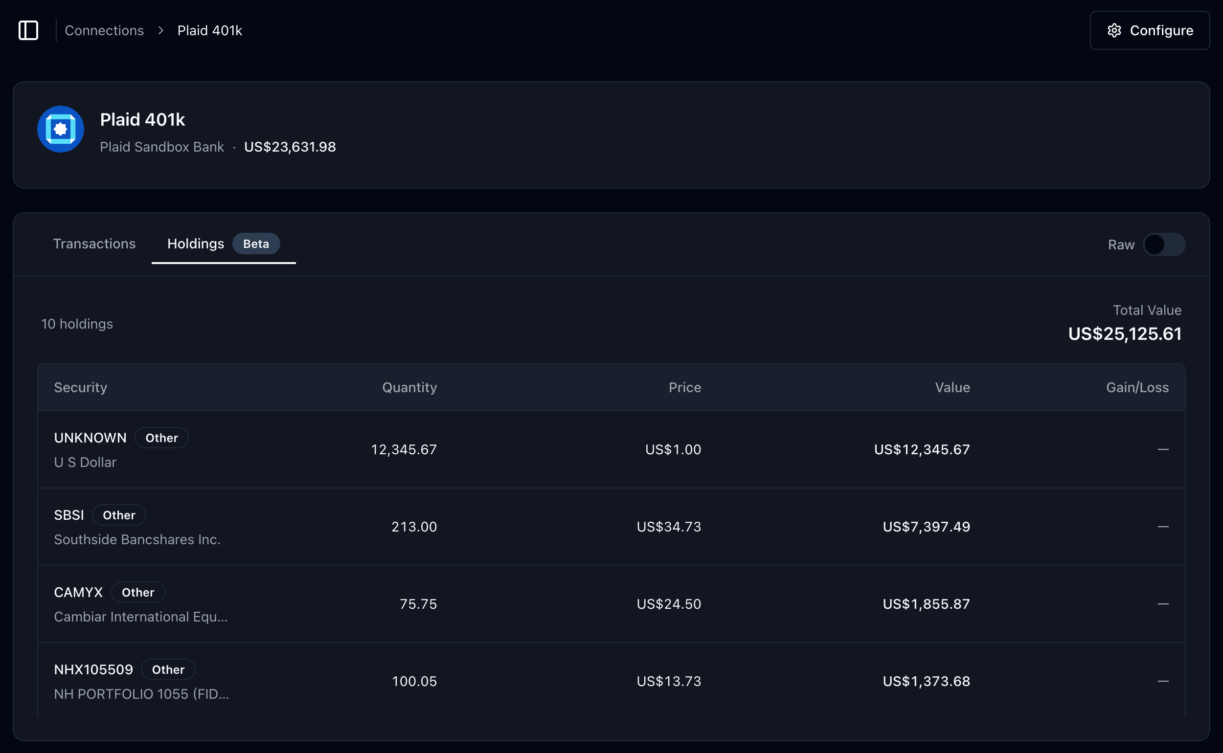 Another requested feature! For investment accounts, in addition to showing transactions and balances, I’m working on surfacing holdings and securities through the API and syncing them to the supported destinations we have.